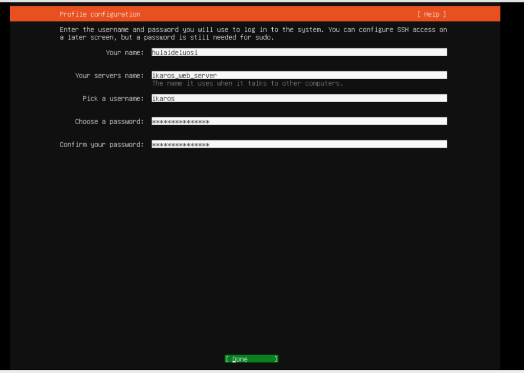 这里的几个名字是your name: 这是你的名字,没有系统作用,your servers name:这是标识你主机的名字,在网络或者其他地方会标识给你让你辨识主机,pick a ysername:这是进入系统后管理员的名字,好好取并记住,一会初始化系统要用,然后是这个管理员用户的密码,然后时确认密码。