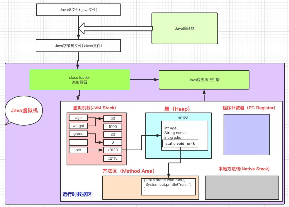 有图可以看出:Java代码被编译器编译成字节码之后,JVM开辟一片内存空间(也叫运行时数据区),通过类加载器加到到运行时数据区来存储程序执行期间需要用到的数据和相关信息,在这个数据区中,它由以下几部分组成: